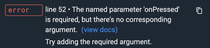 As you can see, some widgets have required parameters. For ElevatedButton you need to specify the action handler. This is true even for a disabled button, in that case, you can just use null as the parameter.