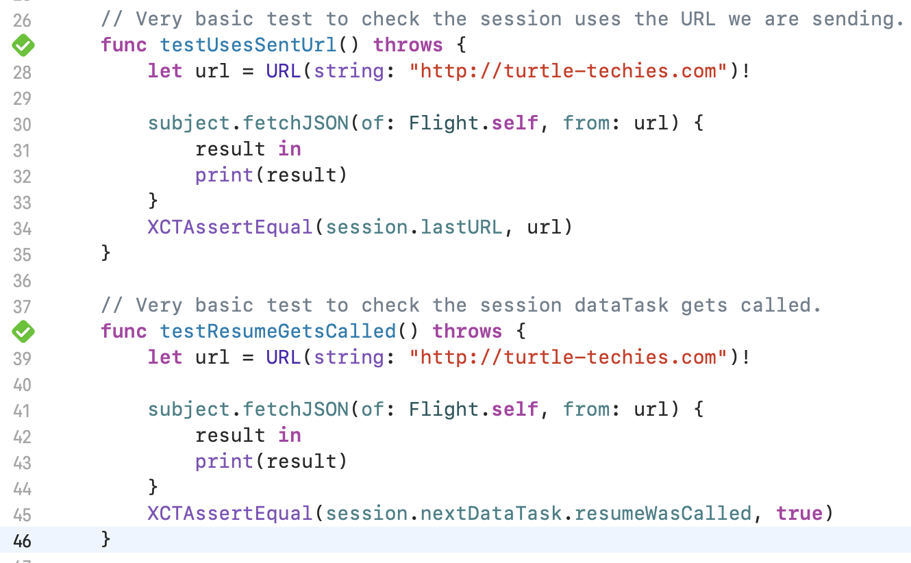 As you can see, all we are doing here is setting a URL, and returning a SessionDataTask that allows us to check if its resume function was called. As you can see, mocking is not limited to the classes we created, but also is useful for system-defined ones.